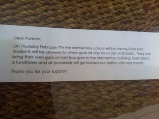 子供達の学校からの手紙です。明日はガムの日で、いつでもガムをかんでいいのだそうです。